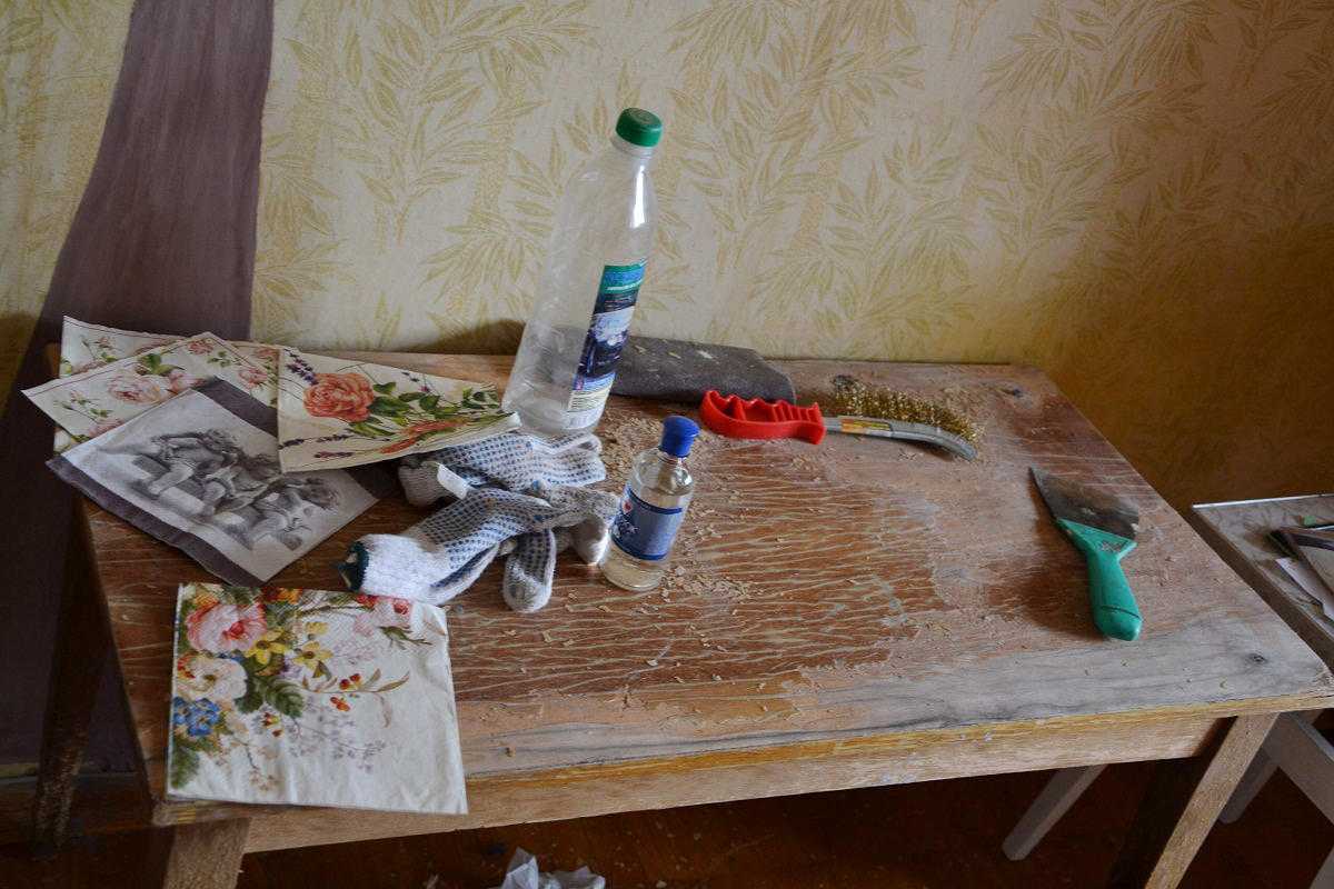 Перед началом декупажа столешницы следует тщательно зачистить ее поверхность с помощью наждачки