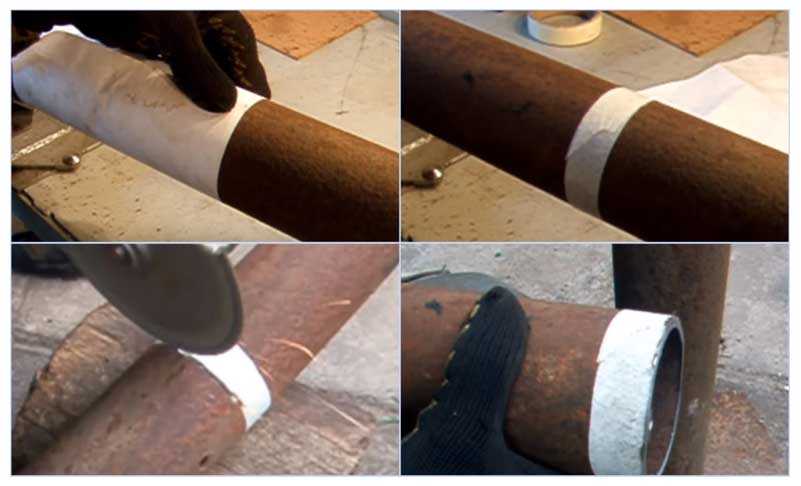 Рекомендуется замотать участок разметки узким скотчем, чтобы нечаянно ее не стереть. Данный метод отлично подходит для длинных крупных труб с местом разреза примерно посередине изделия.