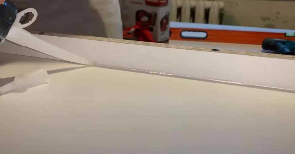 Места стыков нужно будет просиликонить, чтобы предотвратить утечку раствора. При помощи пластиковой карточки убираем излишки силикона, чтобы края столешницы были ровными.