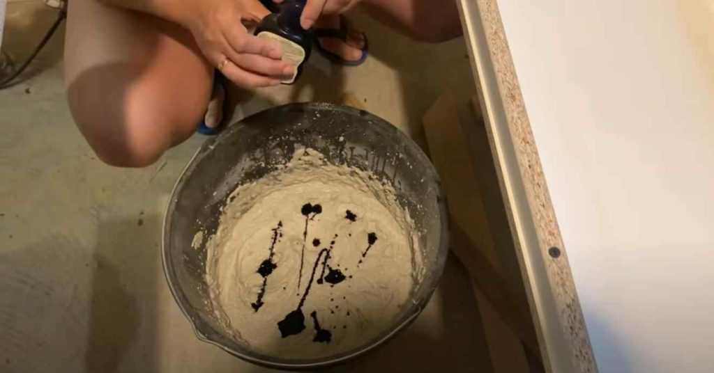Из белого цемента и речного песка (в соотношении 1:2) необходимо будет приготовить раствор. Для создания мраморного эффекта сверху раствора добавляем черный колер. Перемешивать раствор с колером не надо, а то ничего не получится.
