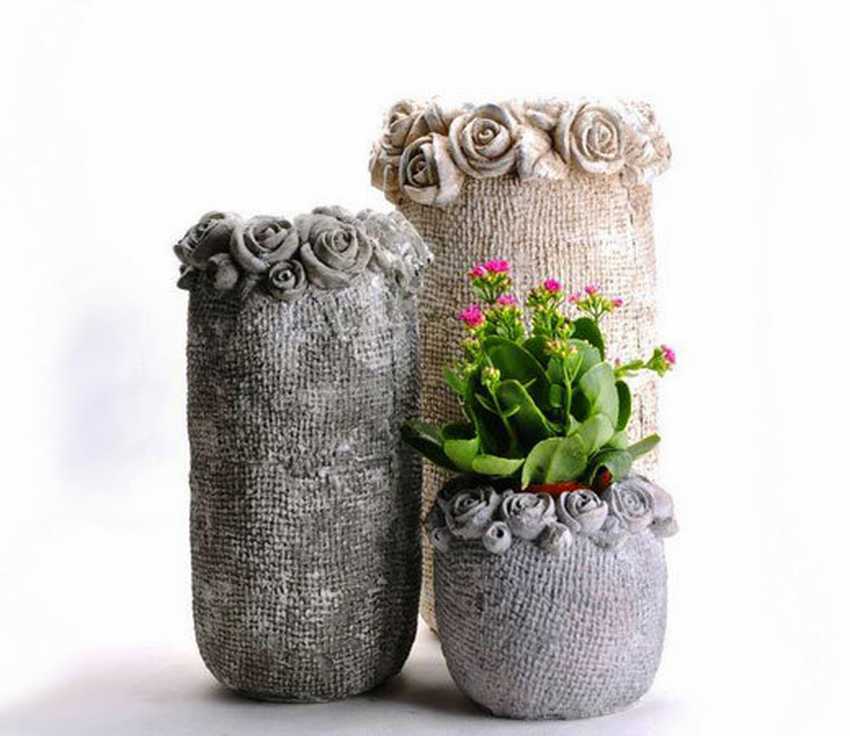 Не стоит использовать чересчур яркие оттенки, ведь акцент должен делаться на живых растениях. Ваза должна гармонично вписаться в естественный пейзаж. Стремясь к натуральности, лучше использовать декоративные украшения из той же самой ткани (розочки, листики и пр.), которые пропитывают цементным составом и приклеивают к основному изделию позже.