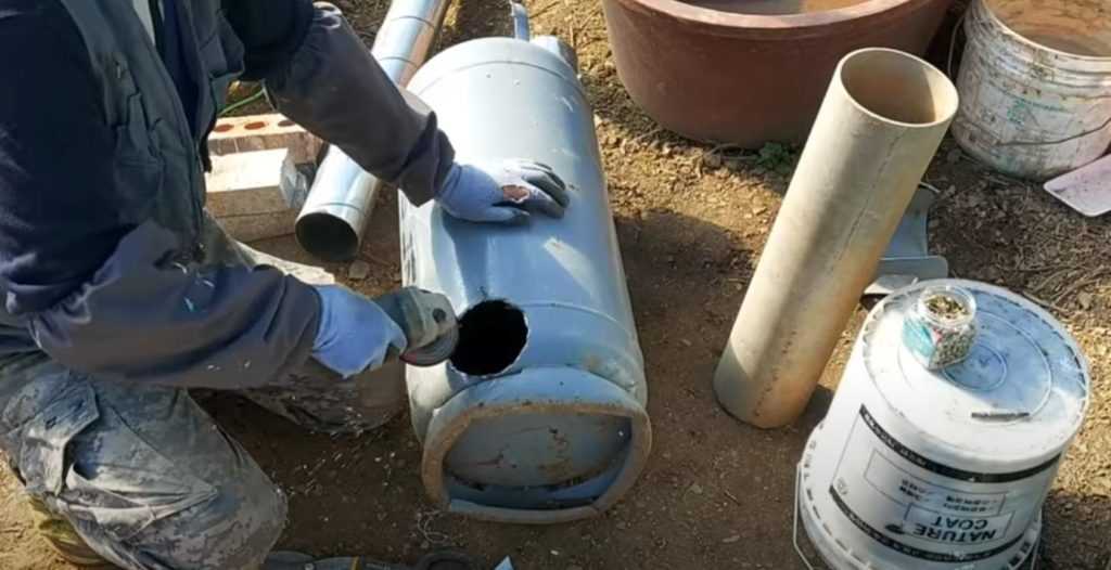 Первым делом вырезаем в верхней части газового баллона два отверстия: одно из них используется для установки дымоходной трубы, второе — для выхода трубы.