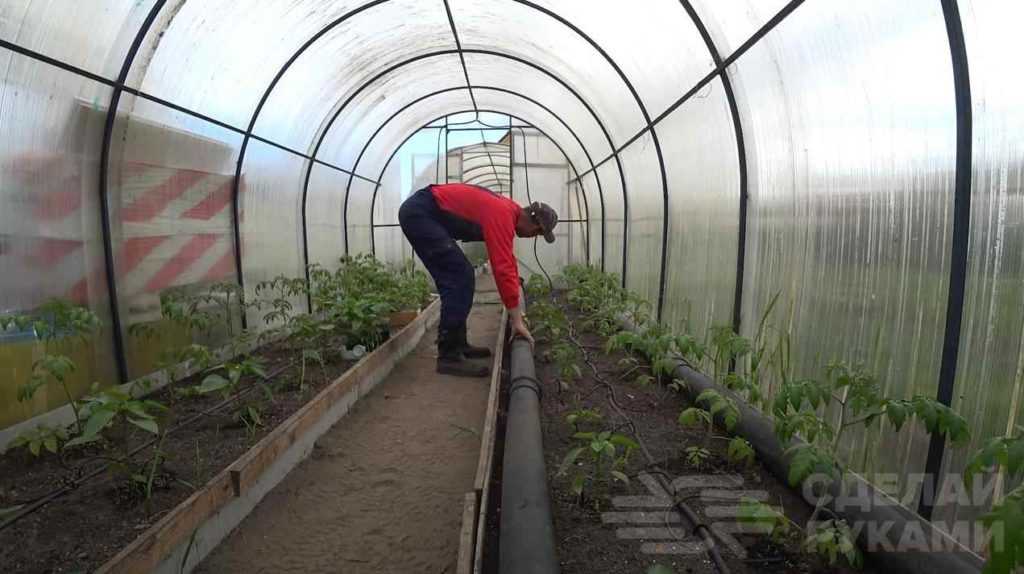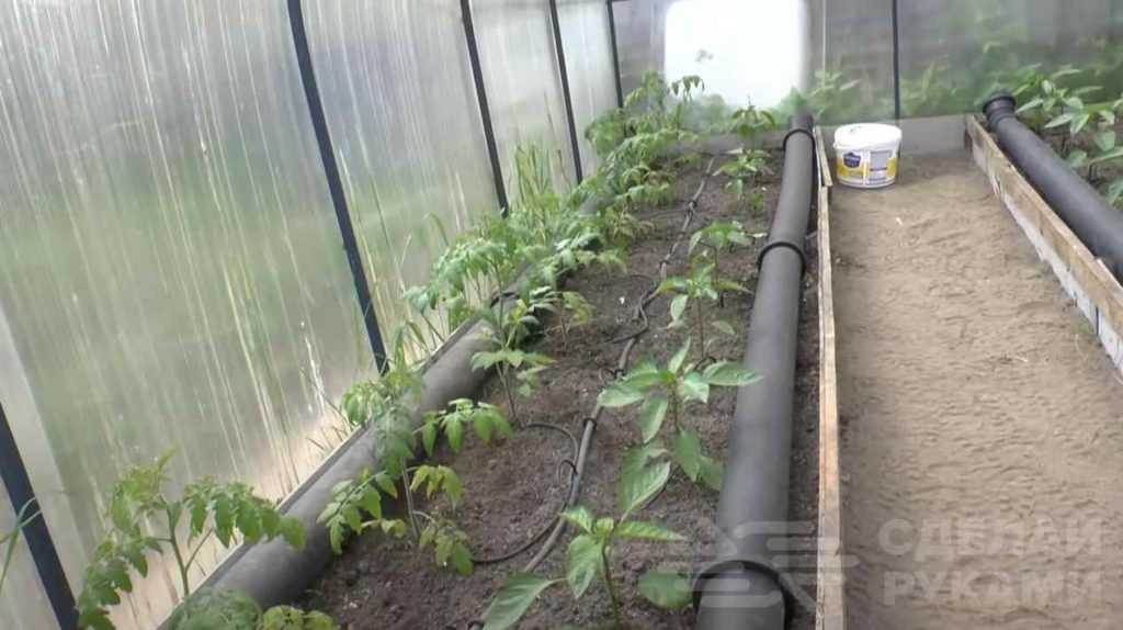 Укладываем ПНД трубы на грядки (ближе к бортикам), после чего заполняем водой. Работают такие аккумуляторы элементарно: за день вода в них нагревается, ночью при снижении температуры — отдает тепло.