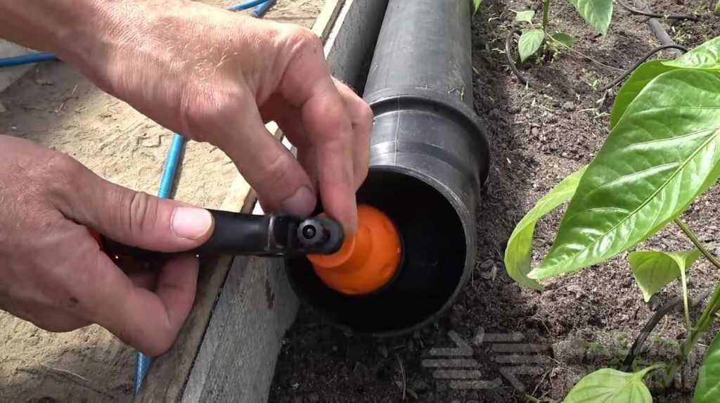 Соединяем ПНД трубы между собой до нужной длины (зависит от длины грядок в теплице). Торцы можно заглушить, а по центру вставить тройник, через отверстие в котором будем заполнять систему водой.