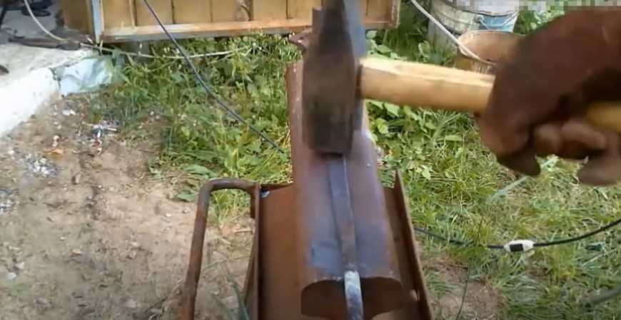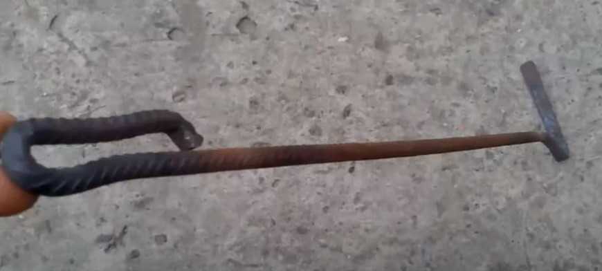 сгибают и приваривают ручку кочерги удобного размера. Сгибают другой конец и отбивают его кувалдой, а затем зажимают полученный инструмент в тиски и несколько раз прокручивают.