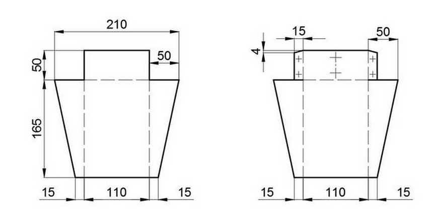 . Между ними и углами противоположной стороны листа проводят линии. Все линии делают заточенным металлическим стержнем. - Ставят лист металла на наковальню и, используя металлические планки, выгибают вверх заднюю часть