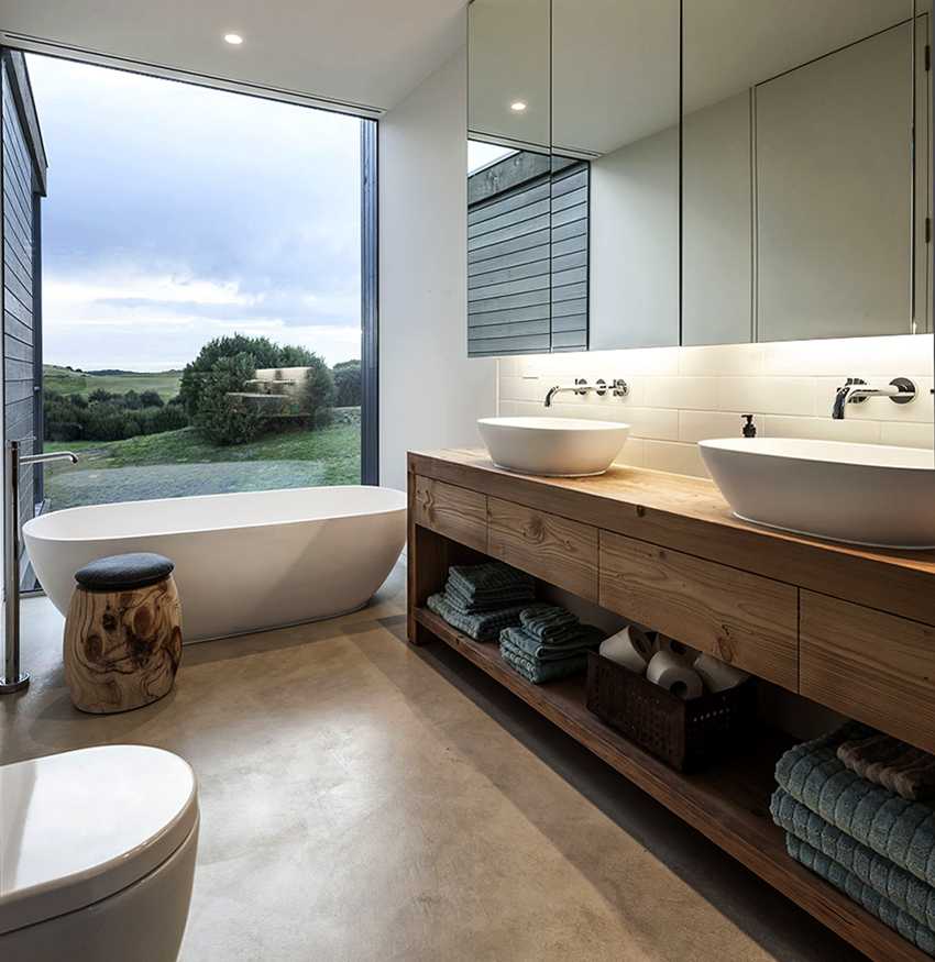 Как я уже писала выше — деревянные шкафы в ванной придают комнате особый шарм. А если они еще при этом интересно расположены, то будут радовать глаз вдвойне.