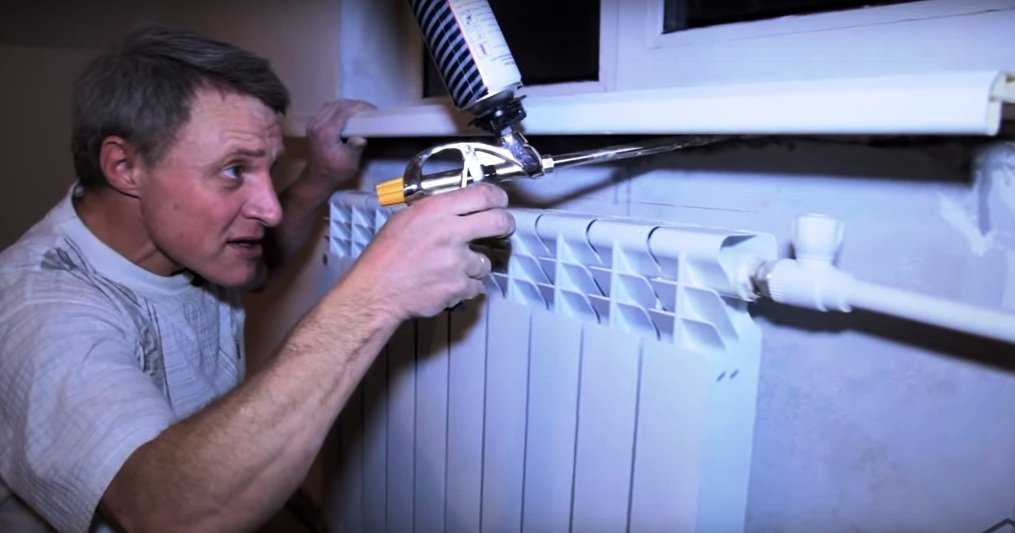 Задуваем всё свободное пространство под подоконником монтажной пеной. Используйте специальный пистолет, чтобы герметик не разбрызгивался по сторонам и не попадал на одежду.