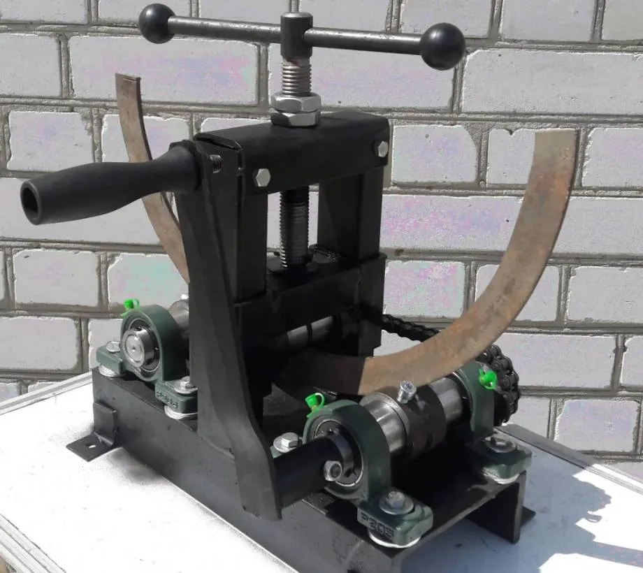 Для этого станка нужна хорошая надежная основа. Это может быть отдельная станина или какой-то верстак или стол. Основа конструкции — валки. Их делают одинакового размера. Два нижних устанавливаются стационарно, верхний — подвижно, так, чтобы в нижней позиции он располагался между вальцами. За счет изменения расстояния между нижними вальцами и верхним изменяется радиус кривизны.