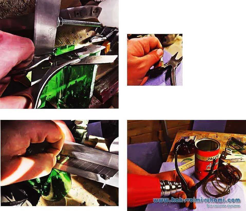 У бутылки ровно, желательно ножницами, отрезается дно и горлышко с «плечиками», остается только цилиндрическая часть. На торце надрезается «хвостик», острый на конце, постепенно расширяющийся до необходимой ширины. «Хвостик» вставляется под проволочную скобку, между лезвием и регулирующим кольцом, остальная часть бутылки – тоже под скобкой, но по другую сторону лезвия.