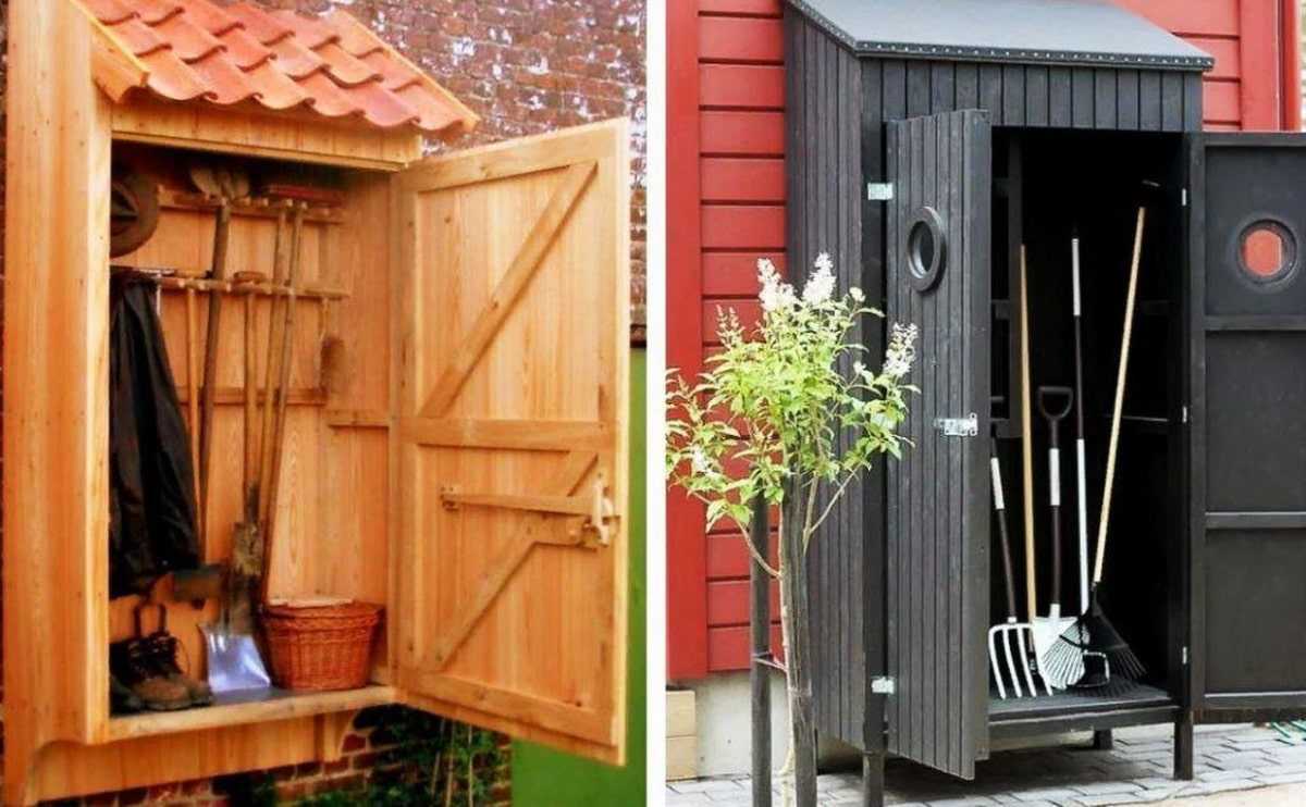 Шкаф для инструмента и инвентаря необязательно делать отдельным строением наподобие сарая. Его можно разместить возле стены дома. Правильные материалы и интересное оформление помогут сделать помещение для хранения стильным и удобным.