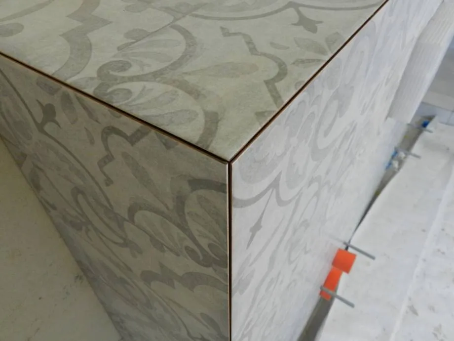 Однако выбирать для облицовки плитку с запилом под 45 градусов стоит ознакомиться с некоторыми недостатками такого решения. Если основание будет подготовлено с отклонениями от прямого угла и ровной линии, то это не позволит сделать качественную отделку. Либо шов получится слишком узким/широким, либо внутренняя часть торца будет соприкасаться/сильно расходиться. Слой затирки должен быть выдержан в пределах допустимого, заполнять шов минимум на всю толщину плитки.