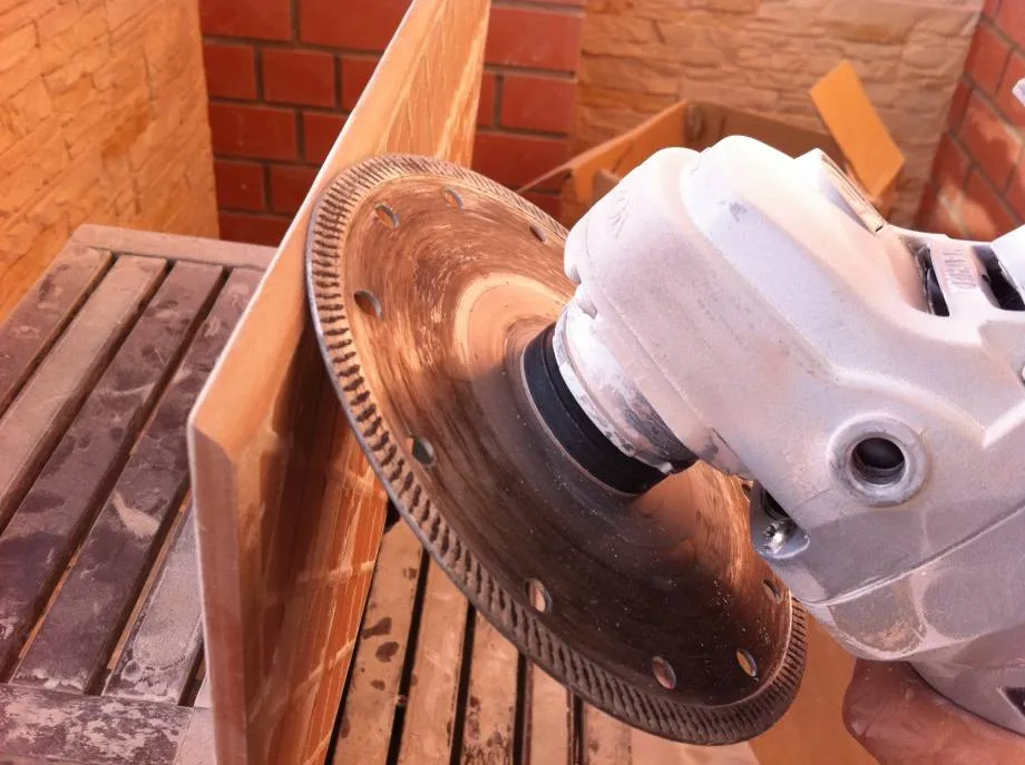 - Запил плитки болгаркой без возможности контроля за частотой оборота дисков. При слишком высокой частоте оборотов диска, края изделий плавятся или крошатся, что недопустимо. Вдобавок, при таких условиях крайне сложно контролировать угол или линию заусовки и шлифовки.