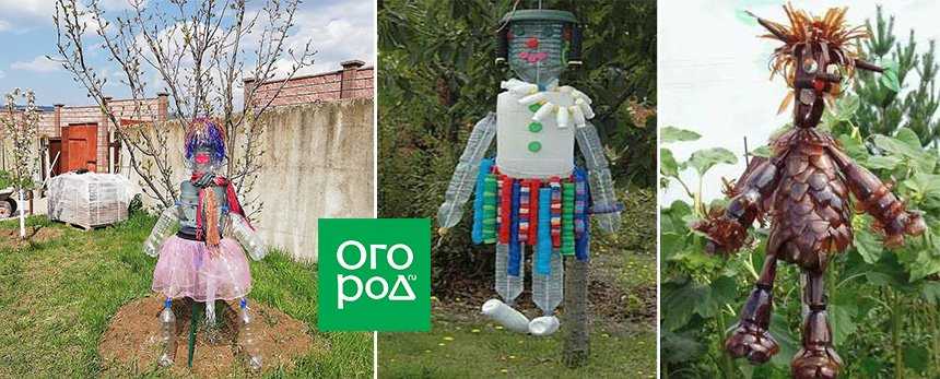 Чучело из пластиковых бутылок прекрасно будет выполнять свою работу: шелестеть, шуршать и тем самым отпугивать птиц, кошек и других животных от вашего урожая. Сделать такое изделие – довольно непростая задача, ведь надо постараться, чтобы все детали легко приходили в движение от ветра. Поэтому лучше всего соединять бутылки и другие части чучела резинками или проволокой. Емкостей понадобится несколько: самая крупная – для тела, поменьше – для головы. На каждую руку или ногу берите по 2-3 бутылки. Дополнительно можно прикрепить к огородному пугалу бусы из пластиковых крышек, колокольчики и т.д.