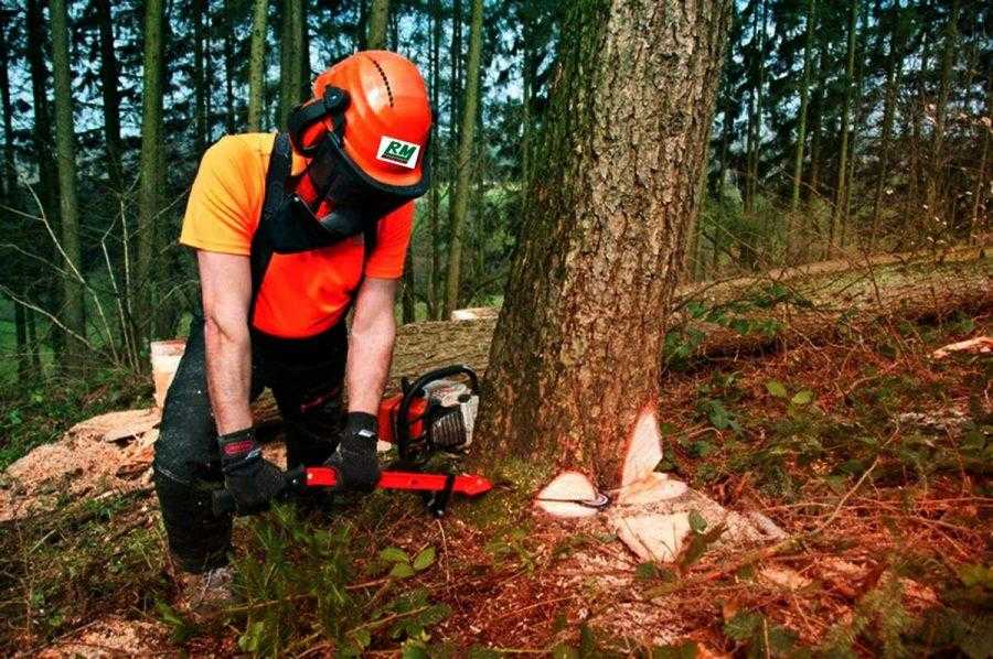 Работать с бензопилой без каски, по крайней мере, неосмотрительно, так как она защищает голову не только отпадающих веток и деревьев, но и от серьезных повреждений после возможного удара цепью при резком откидывании инструмента.