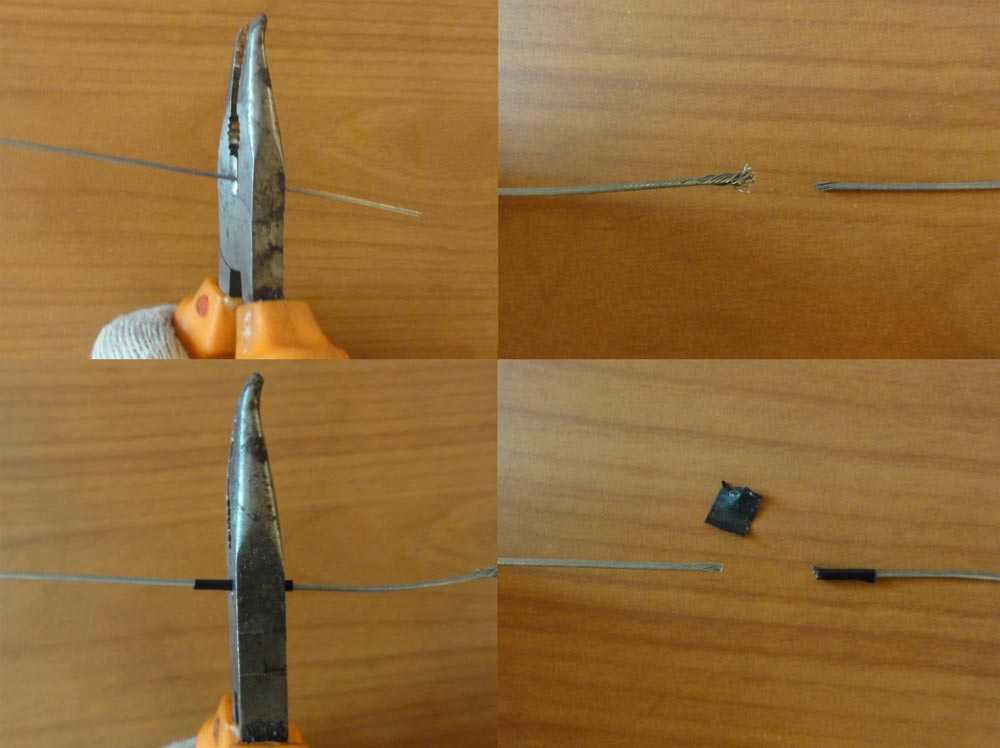 - Обрезать тросик. Чтобы конец троса получился ровным и не разлохматился, делать это лучше всего хорошими острыми кусачками. Но перекусить тросик можно и обычными плоскогубцами, предварительно плотно обмотав его в месте реза изолентой. Если трос не перекусился после сжатия, то нужно не ослабляя усилие, вращать конец тросика, пока он не сломается.