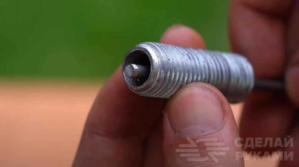 Берем кусок шпильки или отрезаем резьбовую часть от болта. Зажимаем в тисках. Сверлим сквозное отверстие. Потом рассверливаем отверстие в верхней части шпильки сверлом большего диаметра.