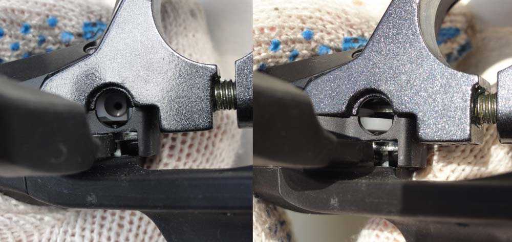 На фото слева – положение, когда выемка для набалдашника тросика и монтажное отверстие совпадают