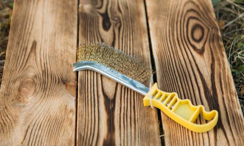 - Термический – слабый обжиг древесины любого вида горелкой с последующей шлифовкой металлической щеткой и тонированием.