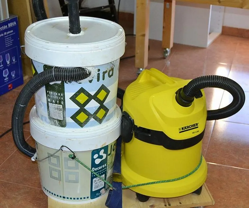 Выполняется самодельный пылесос из двух вёдер (можно использовать обычные тонкостенные ёмкости из-под краски). Внутри каждого ведра устанавливают предохранительное кольцо, которое будет препятствовать их сжатию под воздействием вакуума. Кольца могут быть выполнены из фанеры, толщиной 12–15 мм. При этом их диаметр должен соответствовать размерам ёмкостей, а ширина составлять около 10 мм.