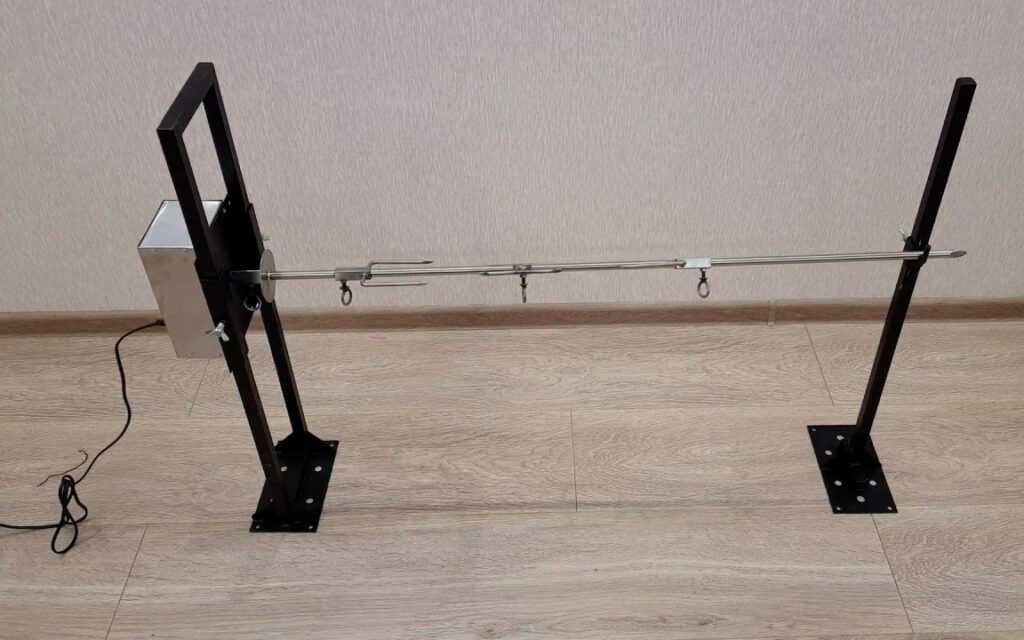 Для этого на прутке имеются два упора (или захвата) с винтовыми зажимами, которые сжимают мясо и обеспечивают дополнительное крепление. Кроме того, эти зажимы служат для исключения проворачивания куска на оси прутка — они оснащены двумя (или больше) выступающими лучами, втыкающимися в мясо и удерживающими его в определенном положении относительно оси.