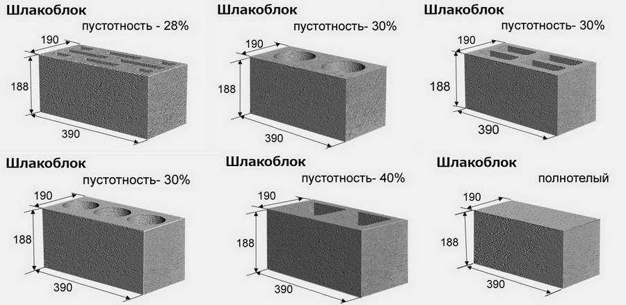 Современный шлакоблок обладает габаритами 188х190х390 мм, полнотелый строительный материал характеризуется достаточной прочностью для обустройства фундаментов и многоэтажного строительства, пустотелые используются во всех остальных случаях. Пустоты могут быть круглой, прямоугольной или квадратной формы, количество варьируется от одной до 8-10 пустот, показатель пустотности лежит в пределах 25-50%. Практически не уступая по прочностным показателям монолитным изделиям, пустотелые шлакоблоки позволяют сэкономить дорогой цемент почти вдвое.