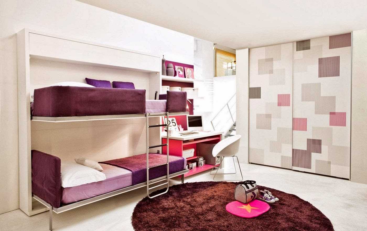 - Двухъярусная откидная кровать, встроенная в шкаф. В собранном виде выглядит как монолитная стена, поэтому ее часто называют невидимкой. Такая модель оснащается несколькими шкафчиками для хранения вещей, может разместить двух детей.