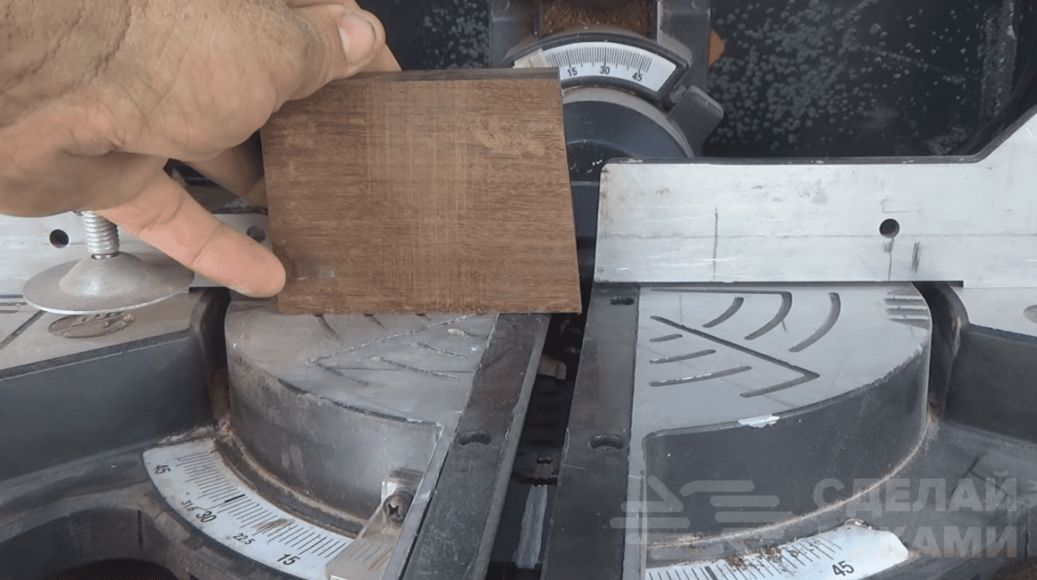 От доски темного дерева нужно отрезать две небольших заготовки, которые торцуем под углом 5-6 градусов. После этого склеиваем все заготовки вместе. Снизу и сверху используем бруски светлого оттенка, а внутри — «вставки» из древесины темного оттенка.