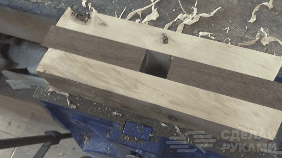 Посередине нужно оставить отверстие квадратной формы под рукоятку. После склейки торцы надо обрезать под небольшим углом, чтобы получились скошенные края. Затем поверхность заготовки необходимо отшлифовать, а кромку пройти ручным фрезером.