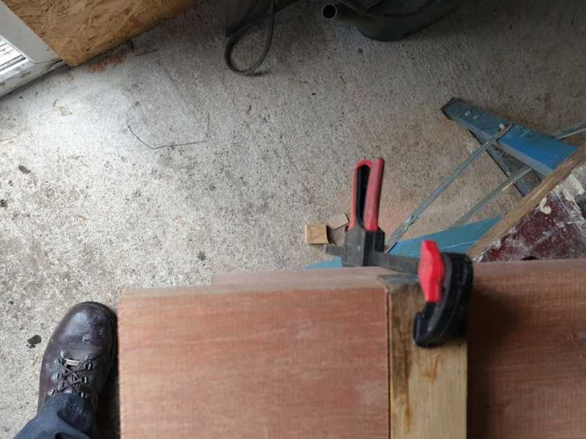 Нанесите толстым слоем клей по дереву на внутреннюю поверхность элемента с одной стороны от рукоятки. Приклейте к ней короткий элемент бойка, не забывая следить за тем, чтобы все углы были прямыми. Край будет торчать, но это не страшно – потом мы его отрежем. Как следует зафиксируйте эту часть зажимом. Уберите излишки клея с помощью ветоши.