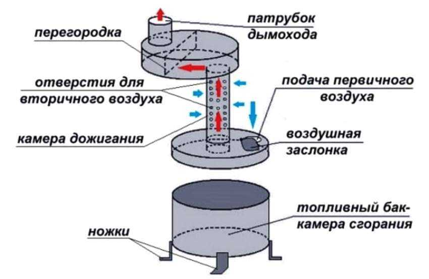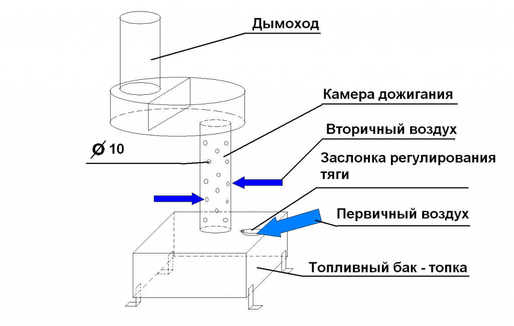 Суть процесса проста: поскольку само по себе масло не столько горит, сколько чадит, его нужно нагреть до температуры кипения и поджечь выделяющиеся пары. Соответственно, нужна емкость для подогрева масла, точки подачи воздуха и камера дожигания. Ну и, разумеется, дымоход.