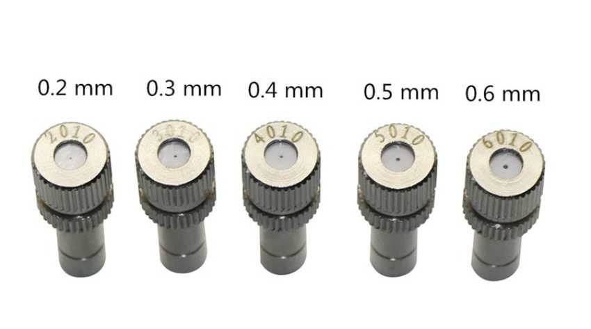 Распылительные сопла низкого давления из нержавеющей стали. Диаметр распылителя 0,2-0,6 мм. Диаметр подключения к разъему метиза 6 мм. Давление от 5 до 20 бар. Имеется противокапельный клапан. Таким образом, при выключении насоса, вода из трубы подачи не каплет через сопло.