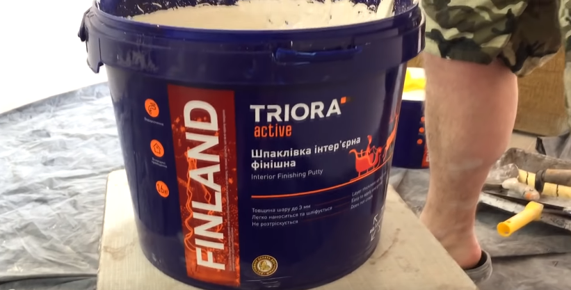Шаг 1. Первым слоем наносим интерьерную финишную акриловую шпаклевку. Состав уже готовый, перед использованием нужно только перемешать.