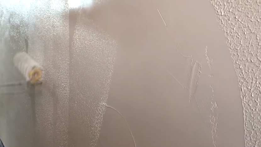 Зашпаклевываем часть стены и сразу же, не дожидаясь подсыхания нанесенной смеси, прокатываем поверхность валиком с длинным ворсом. Таким образом добиваемся появления легкой однородной фактуры.