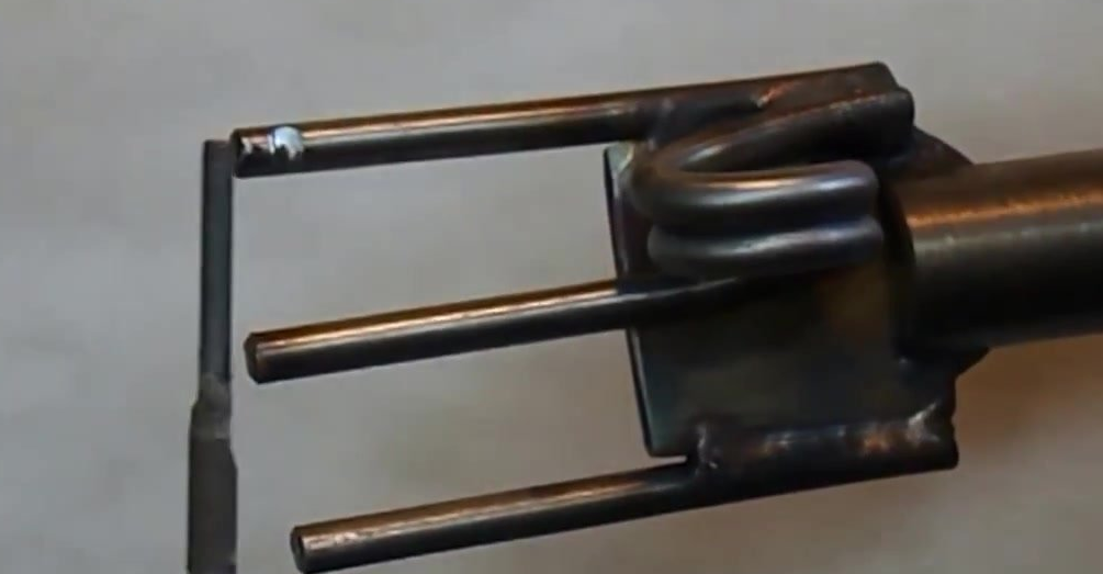 Такой электродержатель уже не встретить в специализированных магазинах, но сварщики старой школы продолжают его использовать. Удержание электрода здесь происходит за счет пружинящего действия трех стальных прутков, сваренных вместе в единую конструкцию, отдаленно напоминающую вилку. Это приспособление легко изготавливается вручную, но обладает рядом серьезных недостатков: