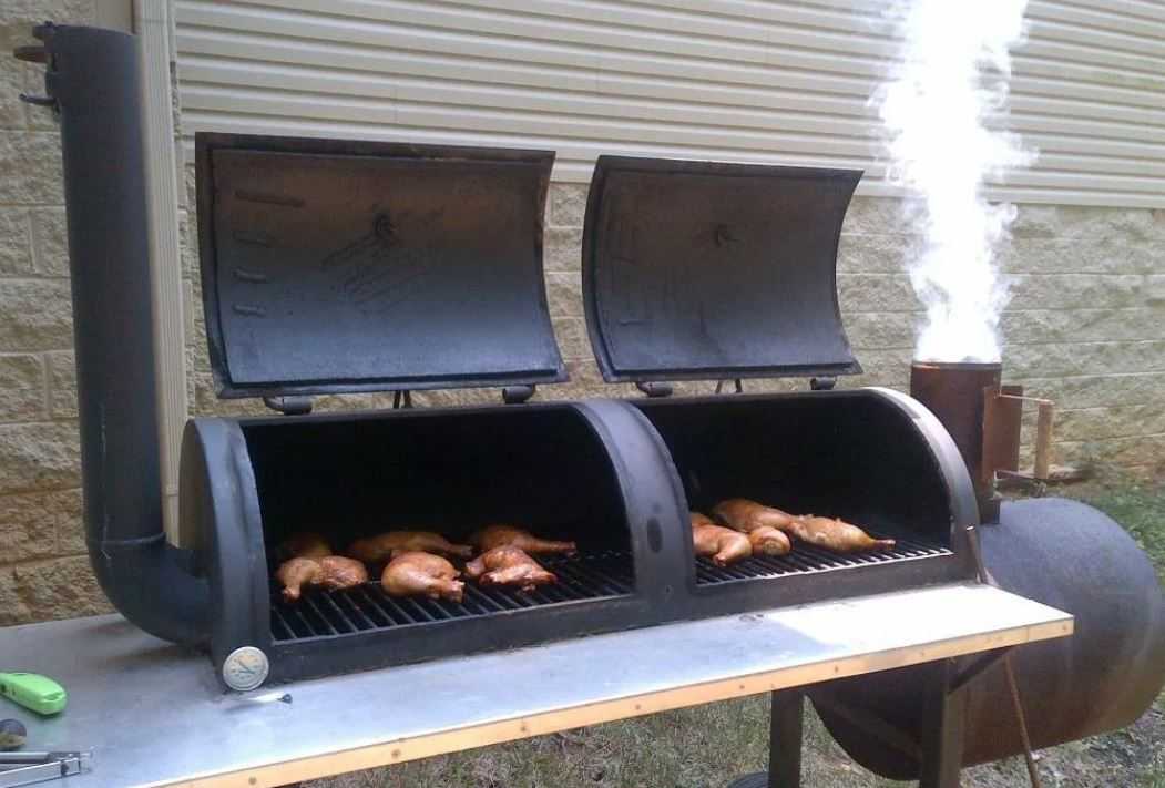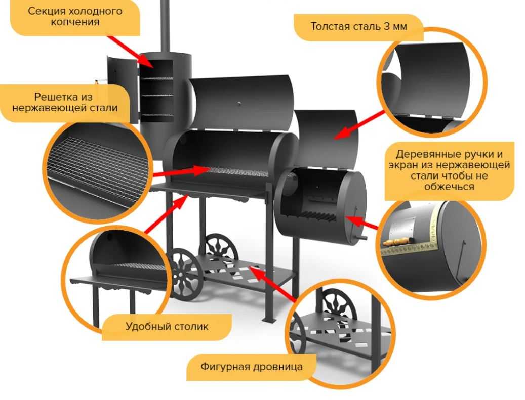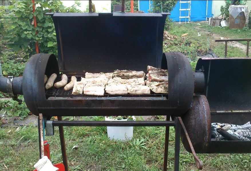 Смокер — это самый сложный тип конструкции. В нем совмещены гриль, мангал, барбекю и коптильня. Это комплекс из нескольких соединенных баллонов, которые используются в соответствии с выбранной задачей. При этом, общий способ соединения и эксплуатации не меняется — производится либо копчение, либо поджарка продуктов над углями.