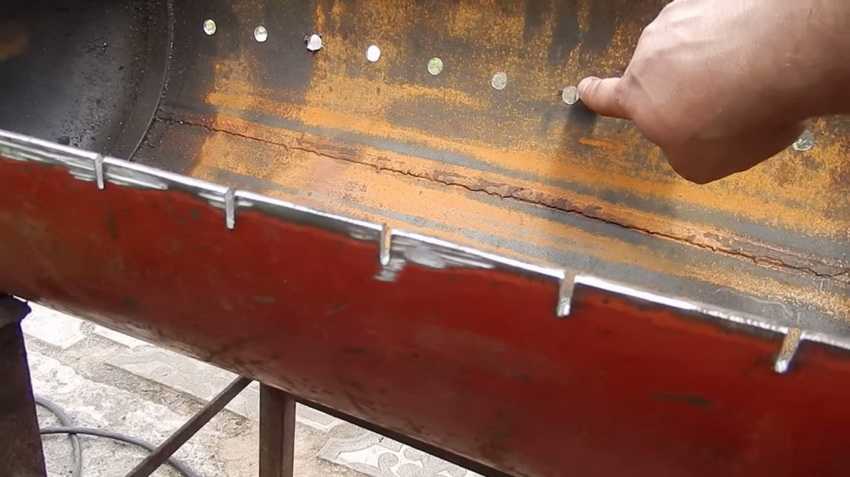 Следующим этапом является выполнение прорезей для поступления воздуха к донной части изделия. Это необходимо сделать, поскольку конструкция сооружения закрыта. А это значит, что угли и дрова будут гореть в ней плохо без доступа кислорода. Для этого мангал следует перевернуть вверх дном. От шва откладывается по 10 см в обе стороны. От получившихся линий отмеряется расстояние 10-12 см. Таким образом, получаются продольные полосы заданной ширины. Поперек полосы выполняются прорези через каждые 5-7 см для поступления воздуха. Полосы можно заменить отверстиями, но их потребуется большое количество, что займет достаточно много времени.
