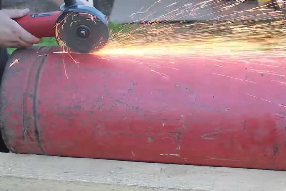 На основании выполненной разметки производится резка изделия. Детально изучить процесс можно на видео «Мангал из газового баллона своими руками». Для этого рекомендуется воспользоваться болгаркой или газорезкой. Распил следует начинать от середины и двигаться по направлению к одному из краев. Диск болгарки нужно держать перпендикулярно баллону. Поскольку изделие имеет большую толщину стенок и процесс распила происходит с большой интенсивностью, во избежание преждевременного сгорания диска рекомендуется выполнять резку в некоторых местах не до конца. Такие участки можно впоследствии перекусить с помощью зубила.