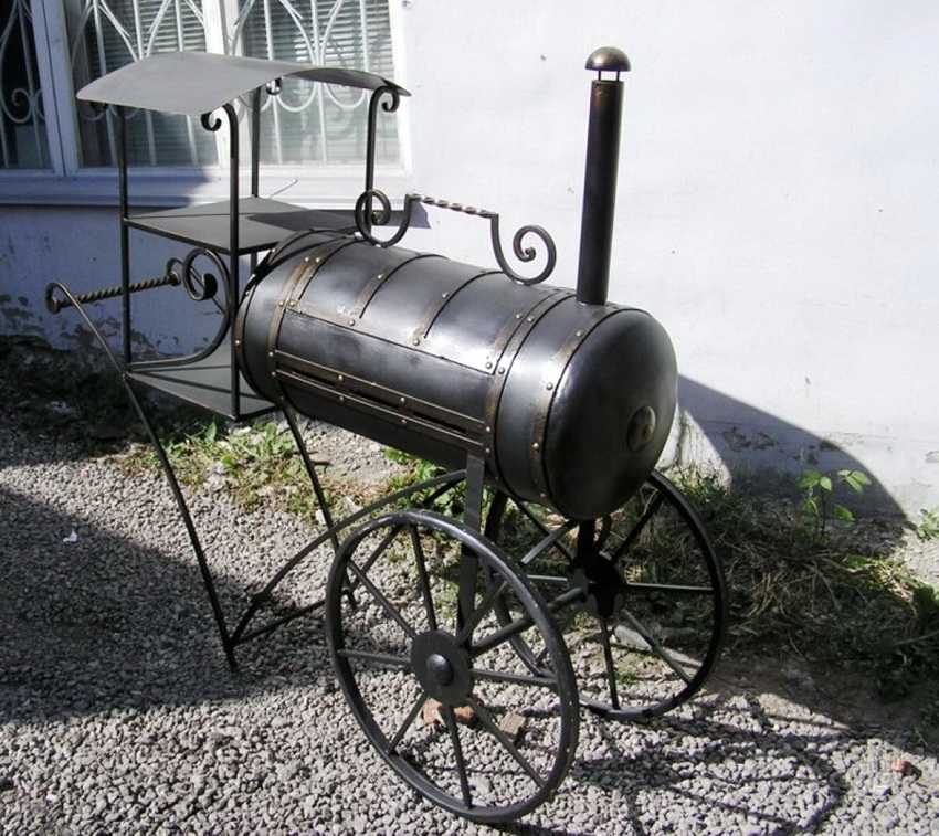 Самым сложным в исполнении и многофункциональным сооружением является смокер, который еще называют паровозом. Для изготовления конструкции понадобится несколько баллонов, каждый из которых будет выполнять свою функцию. Данное приспособление совмещает в себе возможности мангала, барбекю, коптильни и гриля.