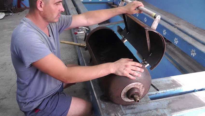 При подготовке газового ресивера извлекаются вентили и кран буксы, после чего баллон следует на две трети залить водой, и закипятить . Далее вырезается сектор в 1/3 боковой поверхности, который позже будет закрываться специальной крышкой. Для снятия краски с баллона понадобится обжечь его, и, после нагревания, удалить остатки покрытия при помощи наждачной бумаги.