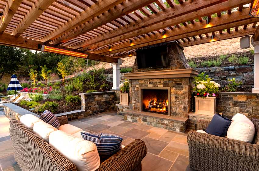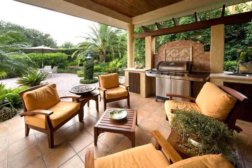 Зону барбекю можно разместить в патио, стены помогут защитить конструкцию от ветра, а близкое расположение к дому позволит использовать все необходимые коммуникации.