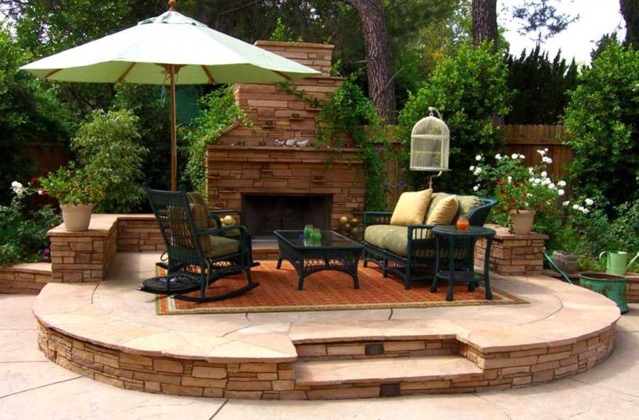 Для патио актуально приобрести специальную уличную мебель, которая не портится под влиянием дождя или палящего солнца. При желании конструкцию можно дополнить навесом в виде большого зонта, как это часто можно увидеть на фото мангальных зон на даче своими руками.