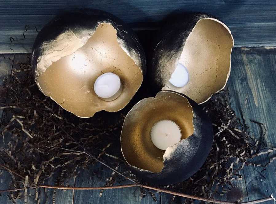 Очень оригинально и изысканно в интерьере смотрятся шарообразные бетонные подсвечники. Они могут быть выполнены по-разному – в виде полноценных шаров (когда бетон заливается в круглую форму, выполняется выемка под свечу) или в формате оболочки полушара (более интересный вариант, который делается проще).