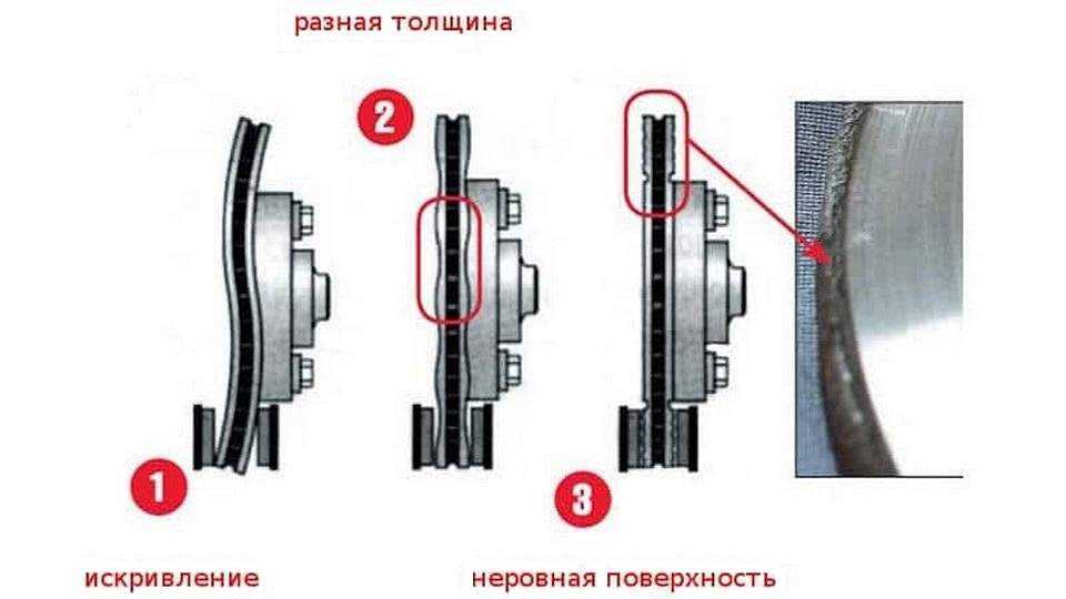 Диски в основном теряют свою плоскую геометрию, когда они сильно нагреты от торможения и затем происходит их резкое охлаждение при заезде автомобиля в лужу. Этот дефект, конечно, можно устранить путем их проточки на токарном станке, но так как при этом уменьшиться толщина деталей, то следующая потеря их геометрии это только вопрос времени. В общем их лучше заменить на новые.