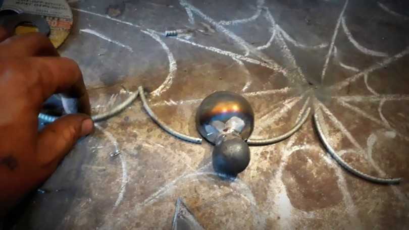Две подковы, глядящие в разные стороны, привариваются друг к другу. Делается ещё такая сдвоенная пара подков. Сверху каждой пары приваривается ещё по одной подкове, свободным концом вверх.