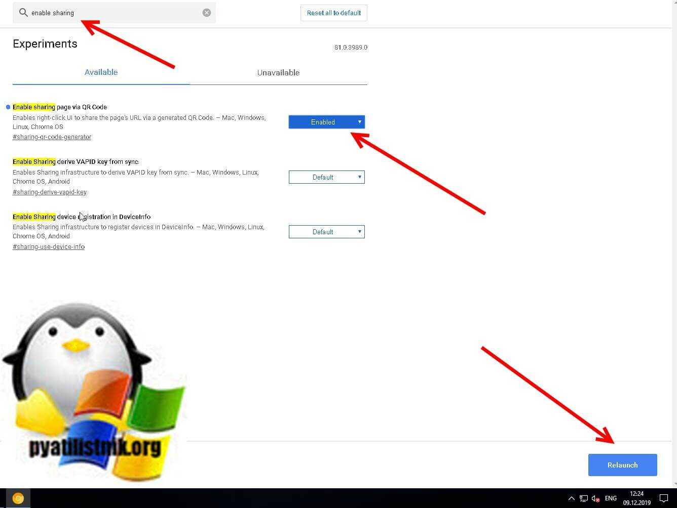 Enable sharing page via QR Code — это и есть функция «Разрешить совместное использование страницы через QR-код». По умолчанию в версии 80 она выключена и имеет статус «Default», поменяйте его на «Enable». В правом нижнем углу у вас появится уведомление, о том что необходим перезапуск браузера, чтобы настройки применились. Нажмите «Relaunch»