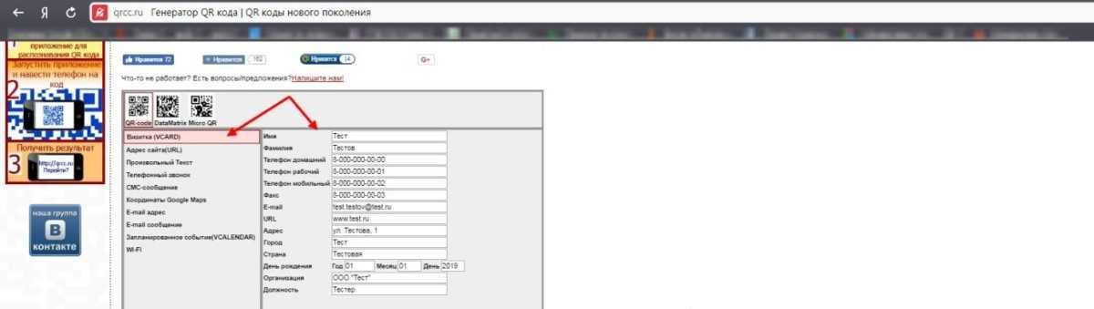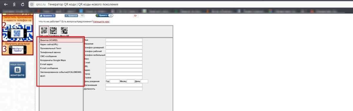 В правой части генератора, обратите внимание на варианты создания: визитка, адрес сайта, произвольный текст, телефонный звонок, и т.д