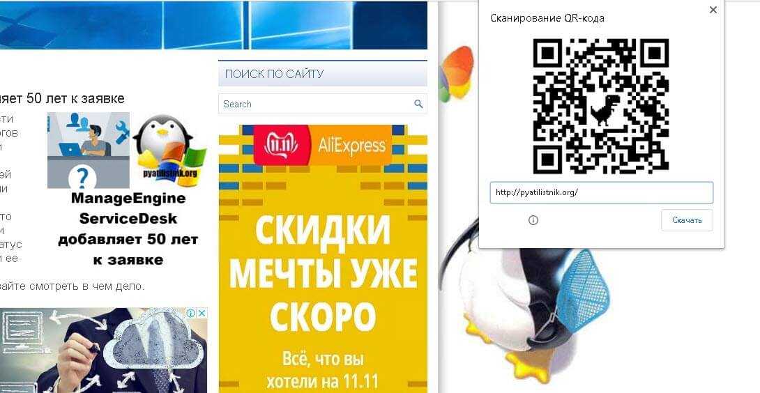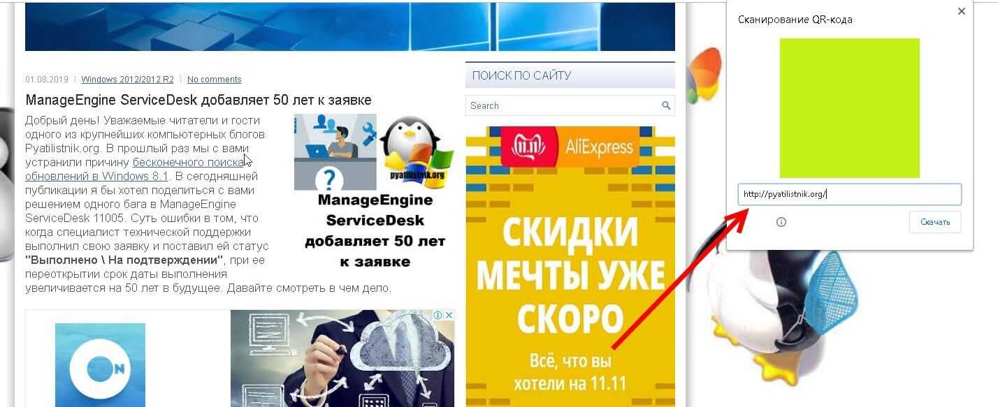 Теперь, когда функция «Enable sharing page via QR Code» активирована вы можете открыть нужную вам страницу. В моем примере будет мой блог (pyatilistnik.org). Щелкните по странице правым кликом мыши и из контекстного меню выберите пункт «Создать QR-код для этой страницы (Generate QR code for this page)»
