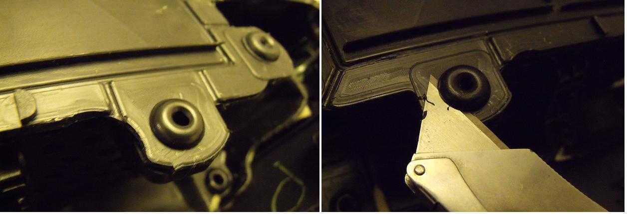Пластиковые клёпки или наплавки, которые крепят вставку к основной панели, можно срезать острым лезвием.
