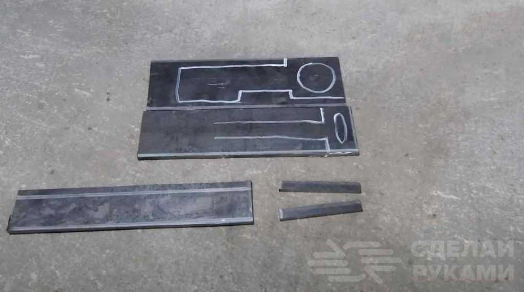 Первым делом из металла толщиной 5 мм необходимо вырезать две основные детали самодельной насадки. Также потребуются дополнительные детали из кусочков металла.